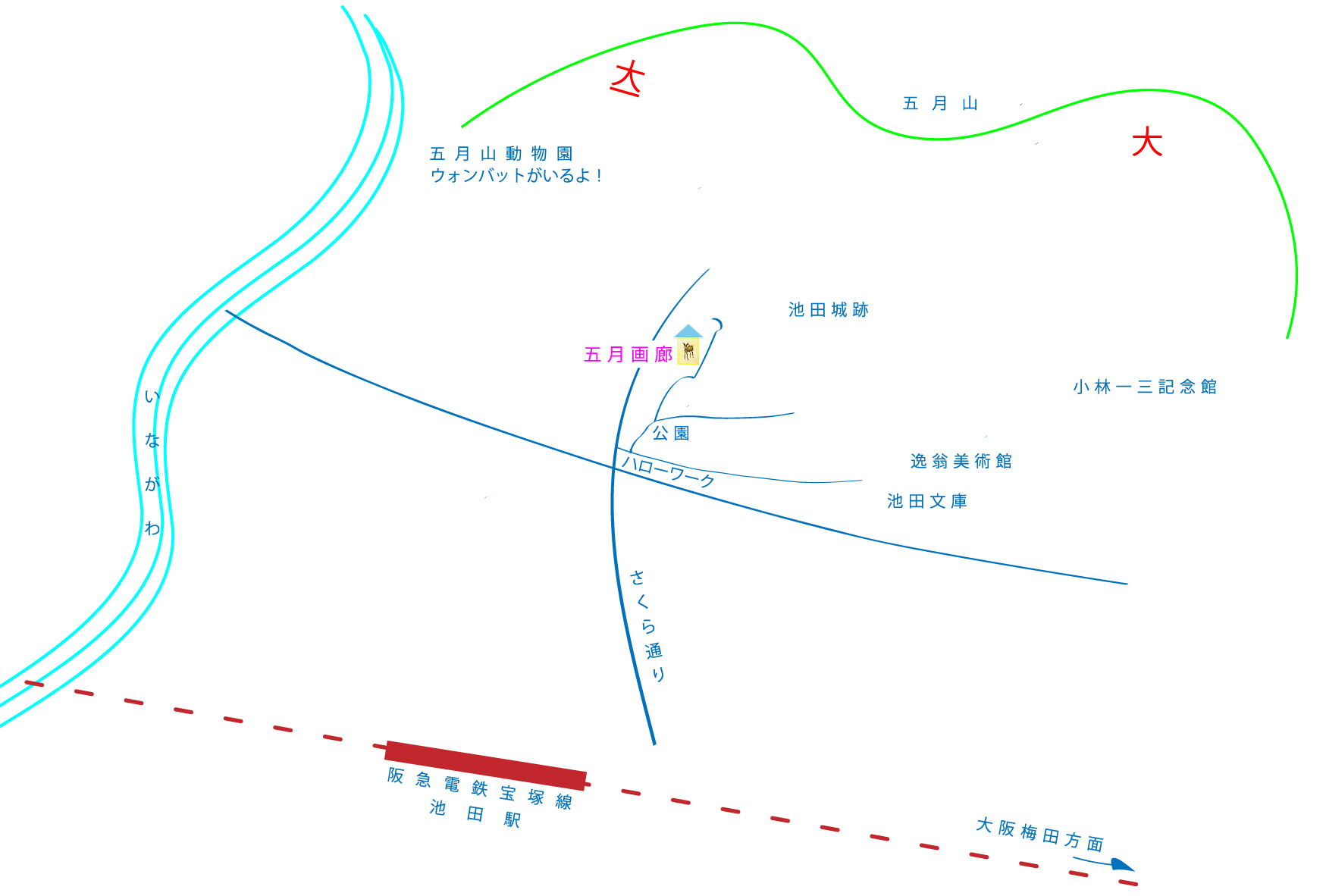 五月画廊は、大阪の池田の五月山のふもと、池田城跡のすぐそばにある小さな集落のなかの古い家を、大工さんがとても丁寧に清潔にリノベーションされた間取り4Kの平屋テラスハウスです。玄関入ってすぐの2フロアは画廊スペース、奥の間はアロマトリートメントのサロンとなっています。最寄り駅は阪急宝塚線の池田駅です。五月山へ向かってさくら通りをテクテク歩いて、だいたい10〜15分くらいです。池田の町は、新しさと歴史を感じる古さを五月山や猪名川の大自然が上手に調和してくれていてとても良いところです。ぜひ一度遊びに来てくださいね。