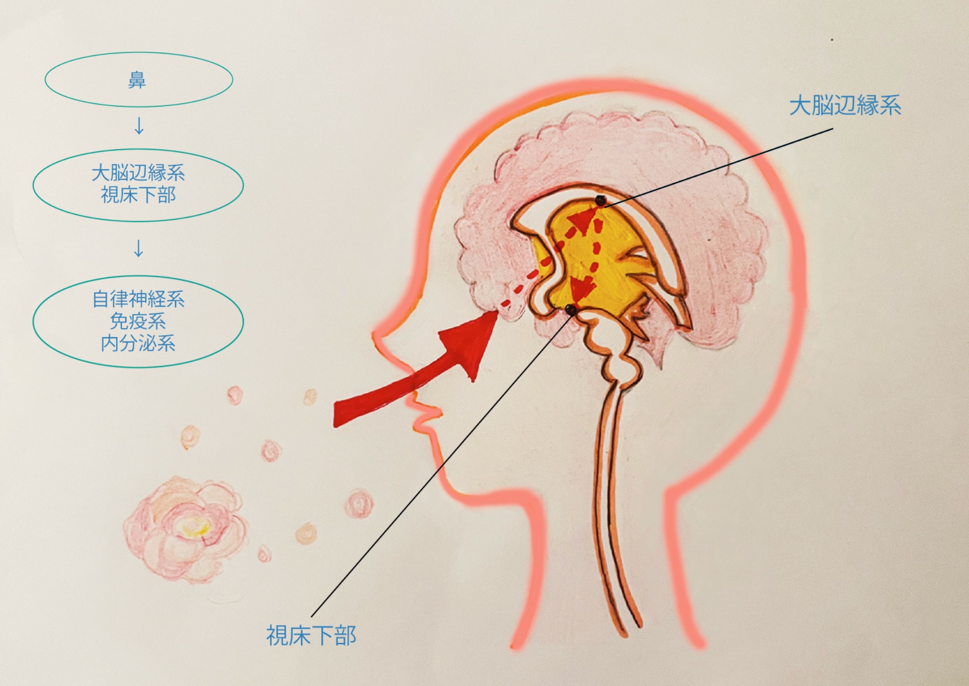 五感の中で唯一脳にダイレクトに伝わるのが「嗅覚」です。香りの分子を嗅覚がキャッチすると、感情や本能をつかさどる「大脳辺縁系」や、自律神経系をつかさどる「視床下部」にその情報が伝わり、体温や睡眠、ホルモンの分泌、免疫機能などのバランスを整えます。また、アロマテラピートリートメントなどによって、精油成分が皮膚から身体に働きかけることもわかっています。