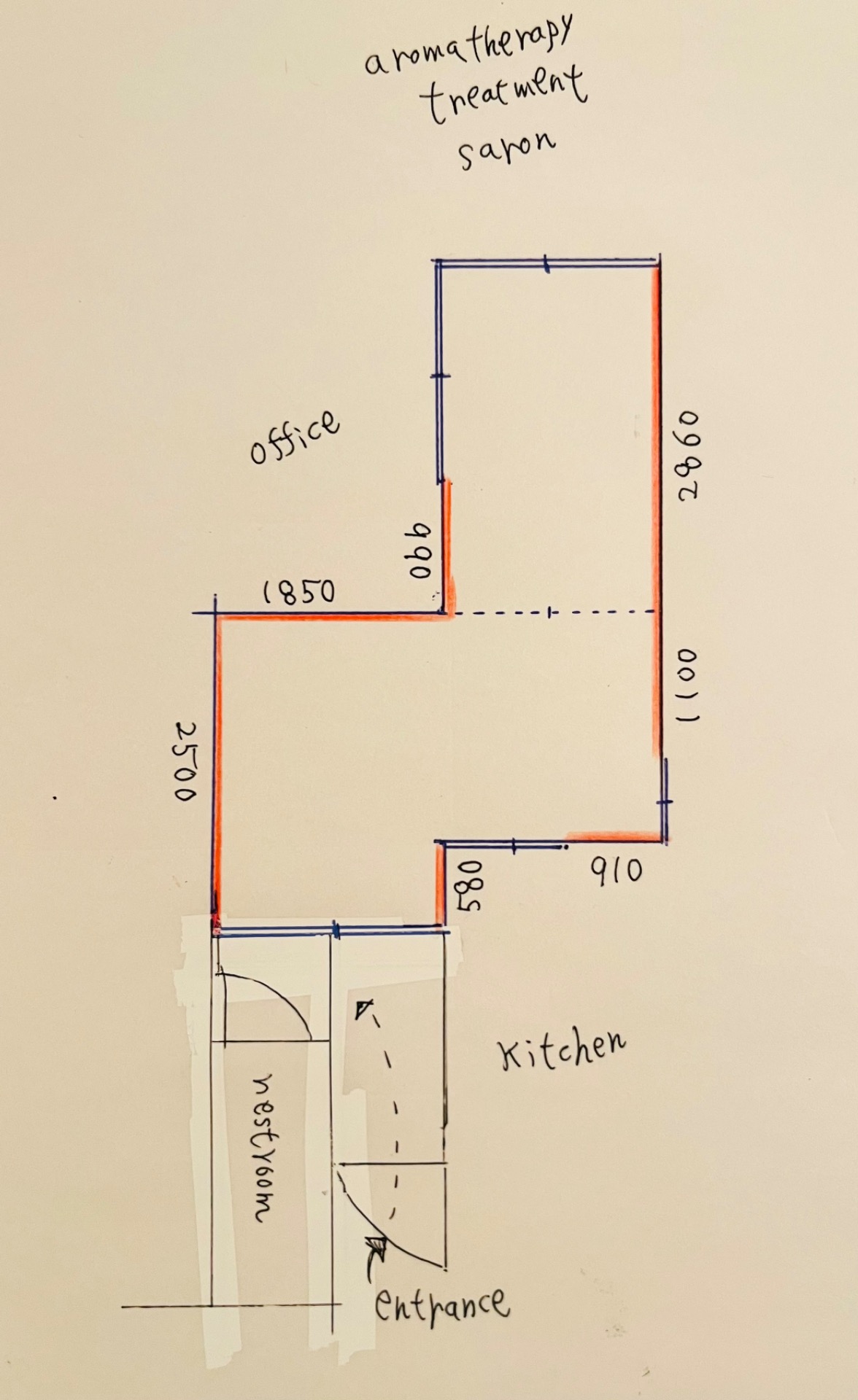 赤のライン部分が展示スペースです。すべてピクチャーレールが設置されていますので必要時はご活用下さい。釘やビスはご遠慮願います。画鋲など細いものであればご使用可能ですが、展示の際はご相談くださいますようお願いいたします。壁と天井は一般家庭で使用される壁紙で白色です。天井は低めです。1850mmの壁部分のみやわらかい白色系の色調のレンガ模様の壁紙となっております。照明に関しては天井にダクトレールを設置しており、自在にハロゲンランプを動かせますのでご活用ください。展開図では雰囲気がわからないと思いますので、まずは一度、見学にお越しいただければと思います。